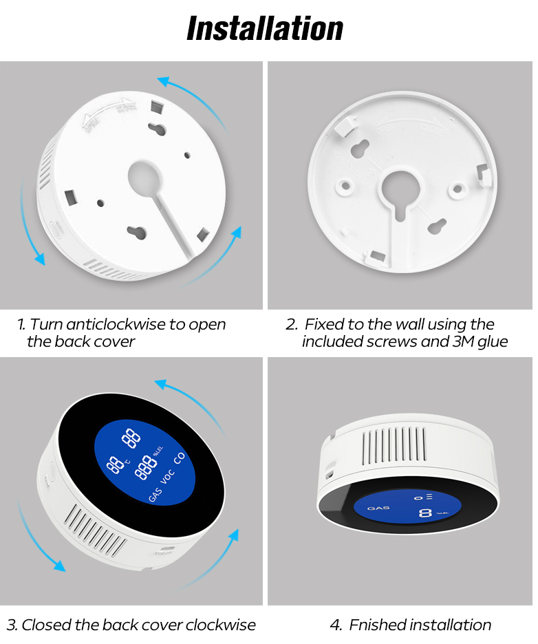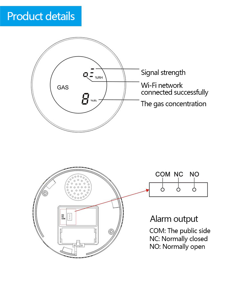 1. LCD Screen Clearly Shows: Easy-to-read and clearly digital display shows combustible gas concentration and WiFi signal. 2. Natural Gas & LGP Detect: Detect the natural gas (Methane) and LPG (Liquefied Petroleum Gas) leakage 3. 85dB Alarm Sound & APP notification 4. WiFi connection, smart APP remote control. With manually test, manually mute. To temporarily mute the alarm in the gas alarm state. 5. New Design and Easy-to-install