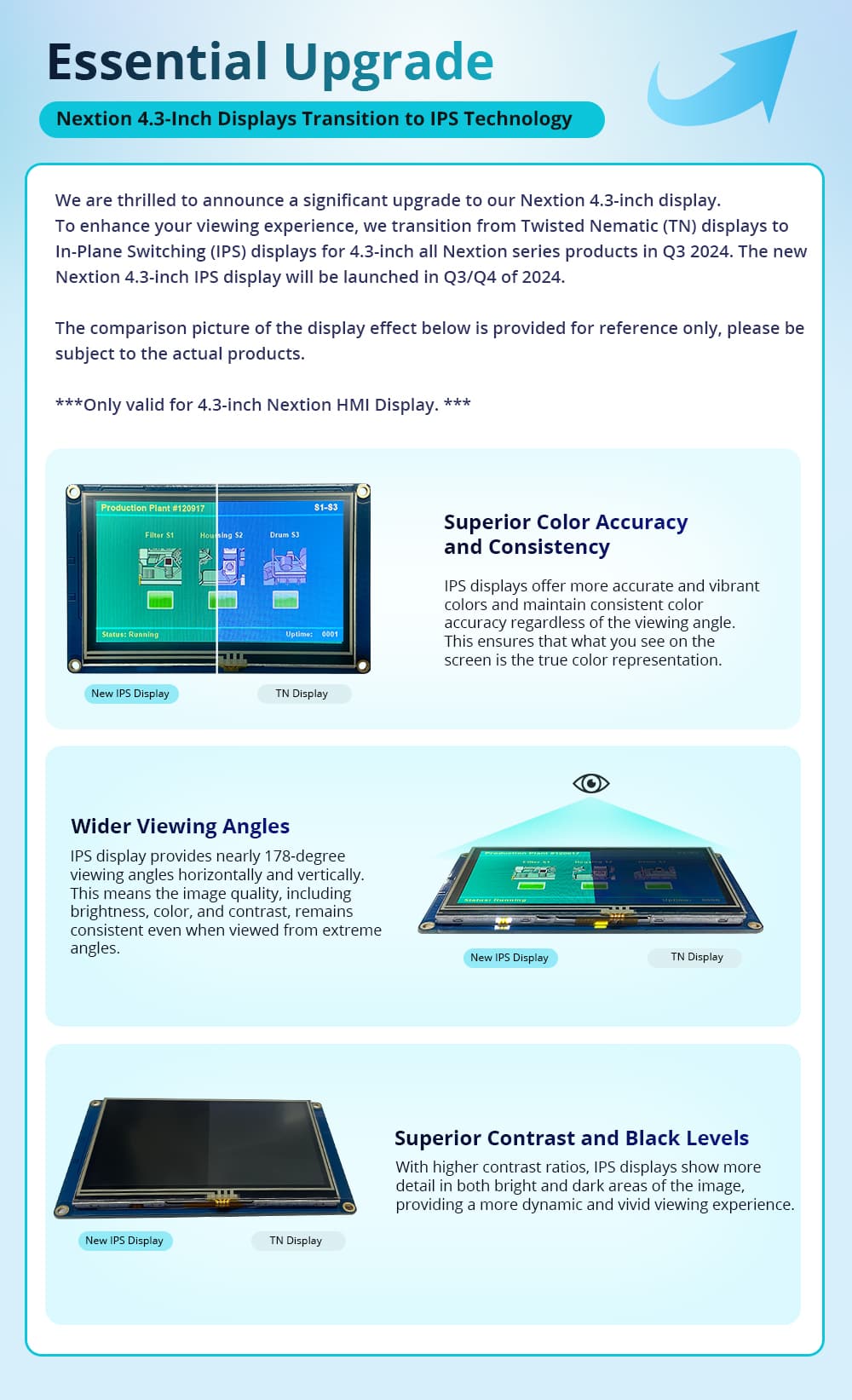 NX4827P043-011R-Y is a Nextion Intelligent series 4.3” resistive HMI touchscreen with enclosure and SKU is 6920075771862 (IPS Display) NX4827P043-011R-Y is a Nextion Intelligent series 4.3” resistive HMI touchscreen with enclosure and SKU is 6920075776492 (TN Display) NX4827P043-011C-Y is a Nextion Intelligent series 4.3” capacitive HMI touchscreen with enclosure and SKU is 6920075771879 (IPS Display) Check the comparison of the display effect between IPS and TN ( the picture is provided for reference only, please be subject to the actual products ). For bulk and B2B enquiries kindly mail us at b2b@itead.in