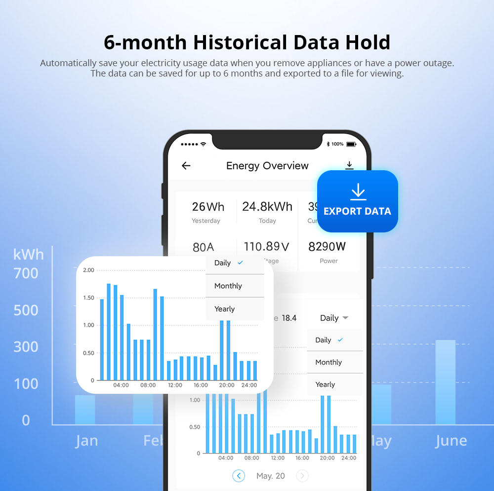 Automatically save your electricity usage data when you remove appliances or have a power outage. The data can be saved for up to 6 months and exported to a file for viewing.