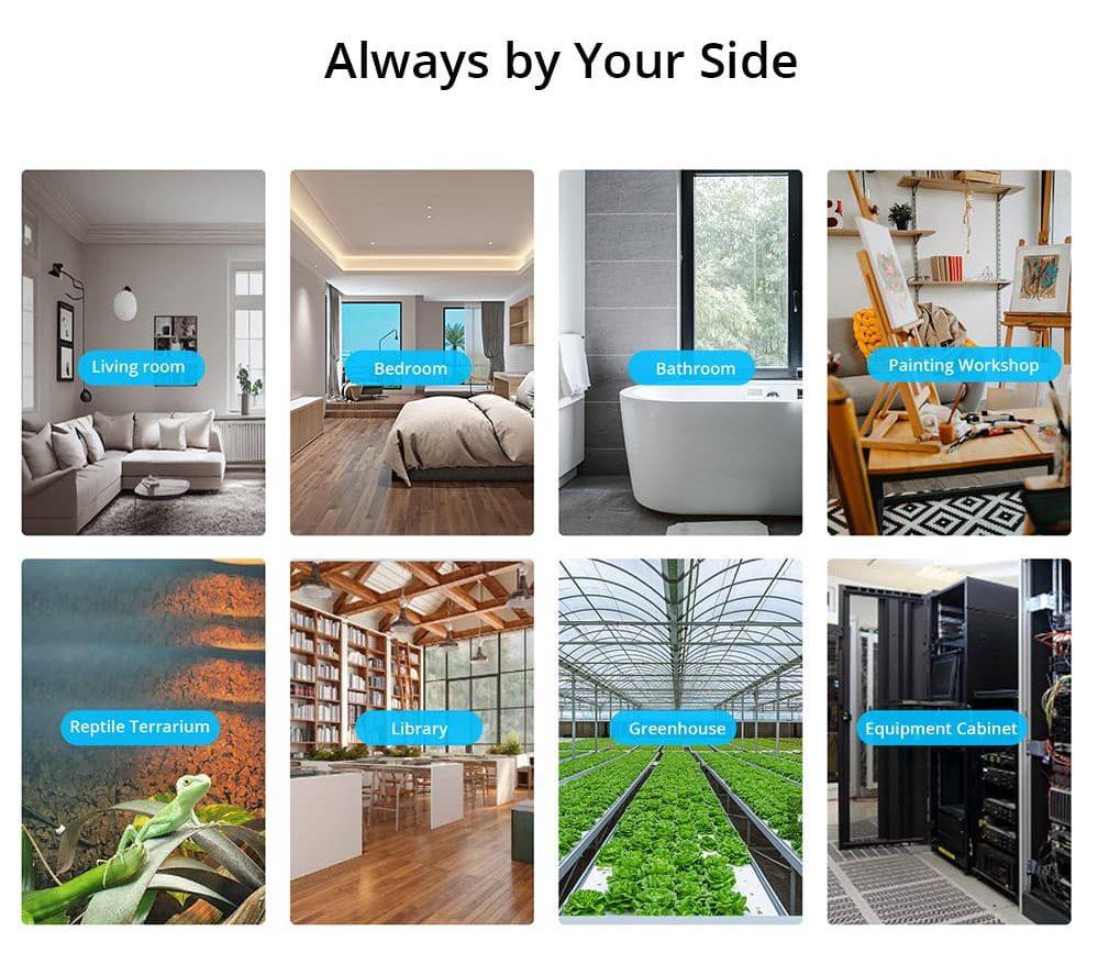 SNZB-02P supports 3 mounting methods, stick with 3M Adhesive, stick with 3M Adhesive and Metal Plate, or screw mount, just place the sensor anywhere you wish such as the living room, baby room, bedroom, greenhouse, reptiles terrarium, equipment cabinet to monitor temperature and humidity remotely.