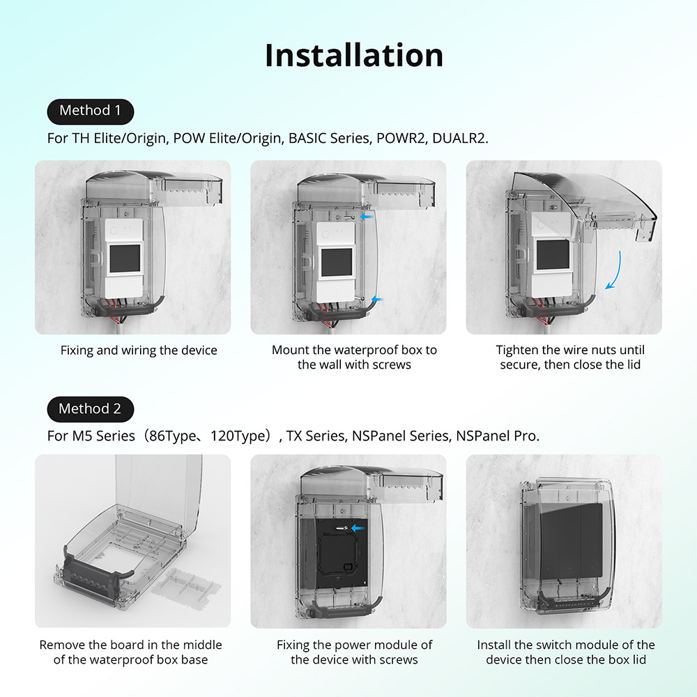 【Water-resistant】Prevents water splashes and perfectly keeps your device dry inside. 【Wide Application】Larger space, compatible with more SONOFF devices, like TH Elite/TH Origin/POW Elite/POW Origin/M5 Series/TX Series/NSPanel Series/NSPanel Pro Series. 【More Durable】Longer service life by PC V0 device enclosure which is dust-proof and prevents objects from squeezing.